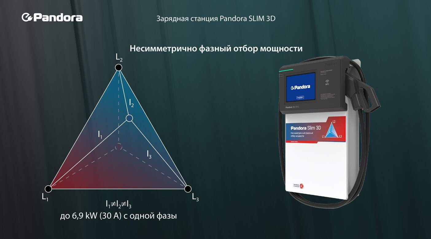 У компании Pandora есть уникальное решение. PandoraSlim 3D – это интеллектуальная зарядная станция постоянного тока мощностью 15 кВт, которая идеально подходит для размещения в частных домах и для использования в условиях ограниченной мощности. В чем её основной принцип работы: станция собирает отдельно с каждой фазы электропитания всю доступную мощность, затем, преобразуя в постоянный ток, отправляет в тяговую батарею электромобиля. Это значительно, иногда кратно, ускоряет время заряда авто, не допуская перегрузки сети, но выдавая каждую секунду всю доступную мощность на зарядку электромобиля.